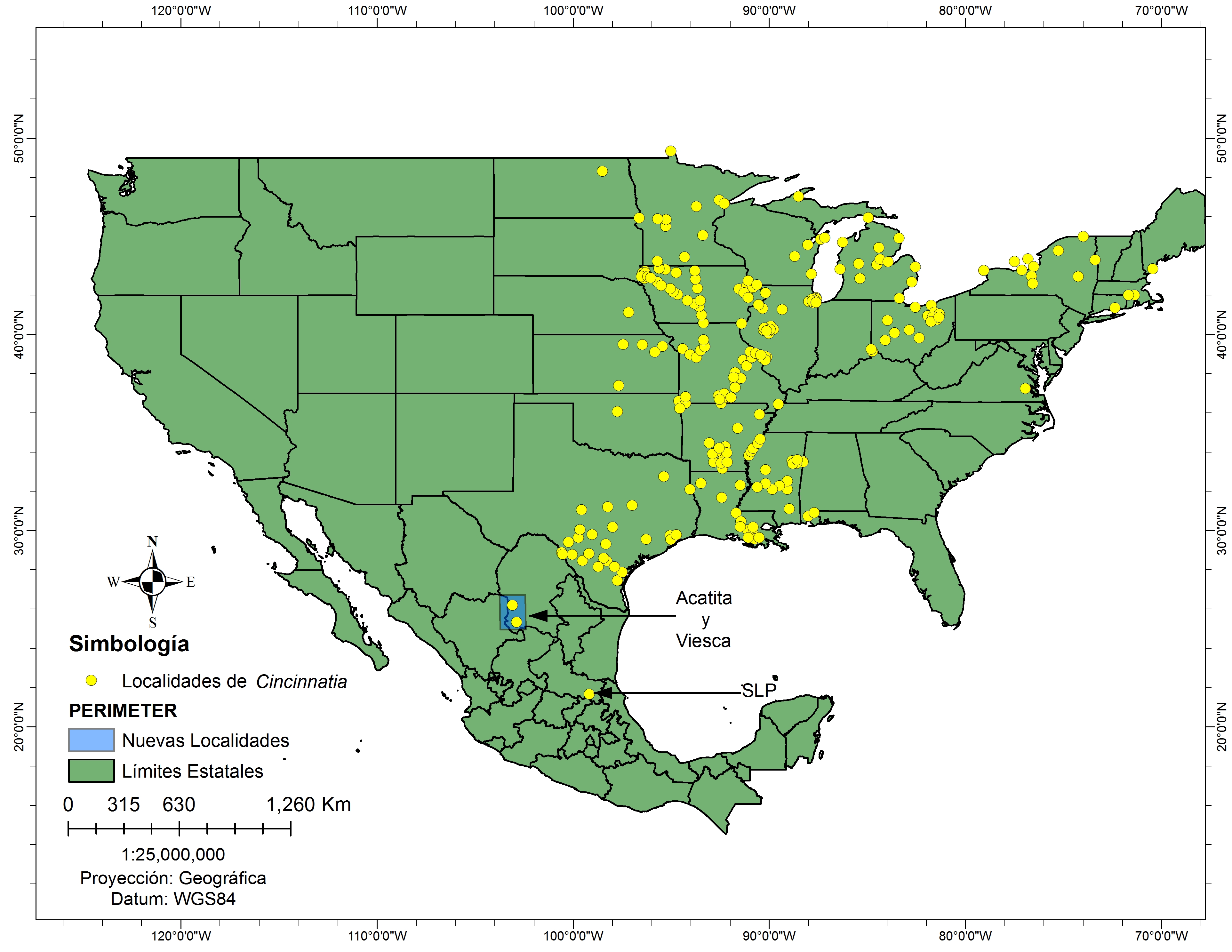 Se describe el primer registro en México de conchas fósiles del gasterópodo de aguas continentales del género Cincinnatia Pilsbry, 1891, encontrados en sedimentos fluviátiles del Pleistoceno tardío en el valle de Acatita, Coahuila. La morfología y el análisis discriminante de las conchas indican que el material fósil corresponde a Cincinnatia integra (Say, 1821), una especie reciente con una distribución disjunta entre la parte oriental de los EUA y sur de Canadá y un área pequeña en la cuenca del río Pánuco, San Luís Potosí, México. Los nuevos hallazgos marcan el límite más occidental de la distribución original del género Cincinnatia y sugieren una conexión entre ambas áreas norte-sur en la extensión original de C. integra, hoy separadas, según registros, por más de 700 km, desde el Pleistoceno tardío hasta tiempos subrecientes. Considerando que el norte de México es hasta la fecha una región poco muestreada con referencia a los miembros de la familia Hydrobiidae, existe una alta probabilidad de hallazgos de poblaciones vivas de Cincinnatia en las cuencas altas de esta región así como en sitios acuáticos de la parte norte de los estados de Coahuila, Nuevo León y Tamaulipas.Citas