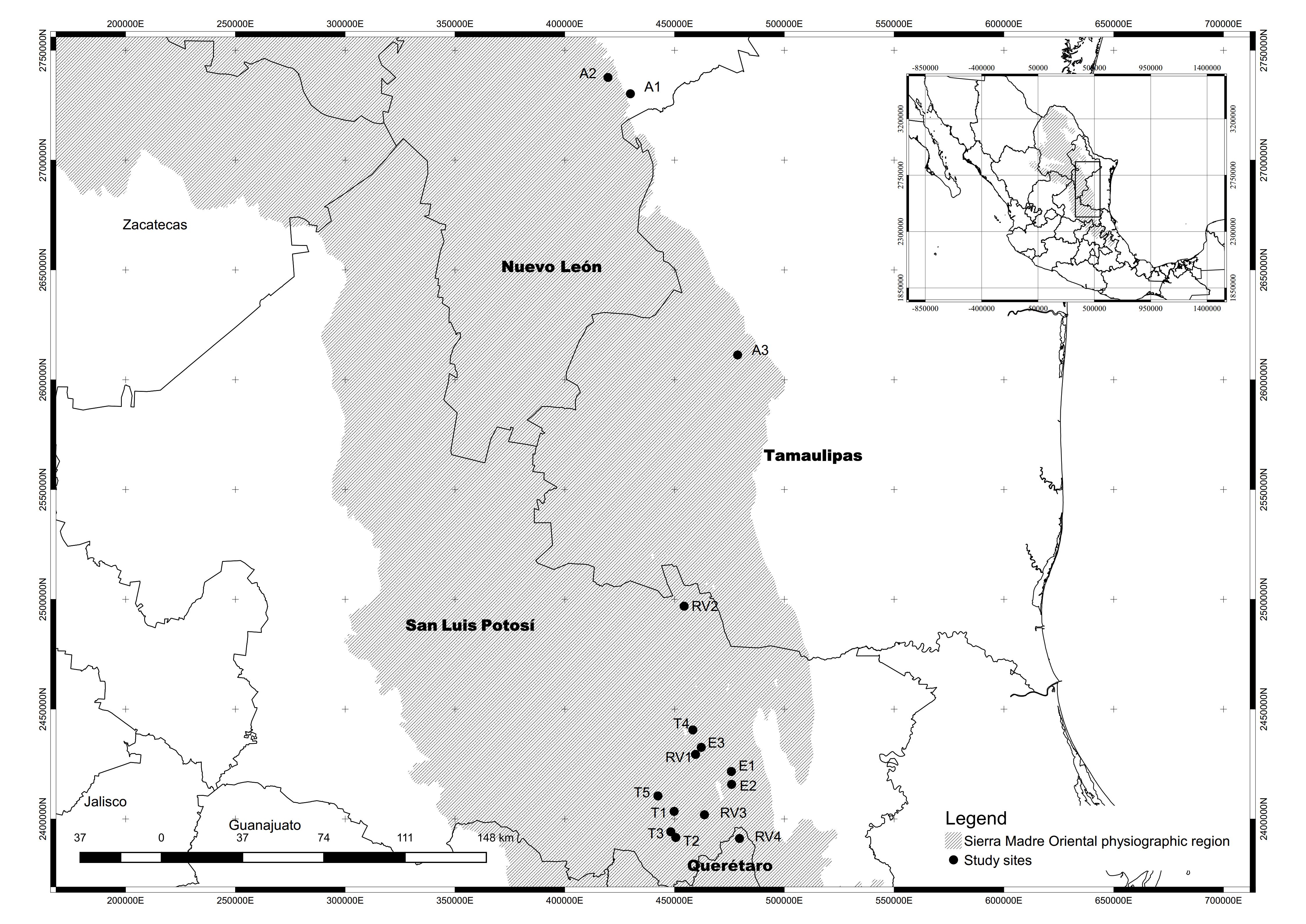 Based on their morphological traits and elevation distribution, we analyzed 15 populations of Dioon edule and D. angustifolium located in the Sierra Madre Oriental in an elevation gradient from 294 to 1,314 m asl, to identify the forms proposed by Whitelock (2004). A non-parametric test was applied to find differences among elevation and populations. A discriminant analysis was applied to classify the population forms and calculate the proportion of wellclassified observations, as well as Maxent to select the environmental predictors of the population’s distribution. Ten populations were grouped into 3 forms proposed by Whitelock (2004): “angustifolium”, “edule” and “rioverde”, but 5 populations could not be classified as proposed forms, and they were named "tamasopo". The forms “tamasopo” and “rioverde” present intermediate values between the 2 species, with 63% of the individuals classified as “tamasopo” and 25% as “rioverde”. Individuals with greater height, diameter, leave length and leave number correspond to the “edule” form in the lowest elevation. The most important variables to define the distribution of the populations are vegetation, slope and annual precipitation.